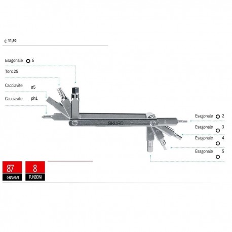 Il MULTITOOL 8 FUNZIONI SKUAD, noto anche come Eight Tool, è un pilastro della filosofia di manutenzione "fai da te ma professionale" promossa da Andreis Bike Store. Nonostante le dimensioni ridotte, racchiude l'arsenale minimo essenziale per affrontare le riparazioni più comuni che si verificano sulla mountain bike.
